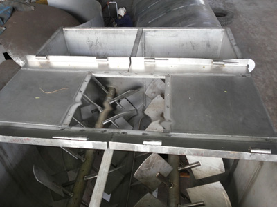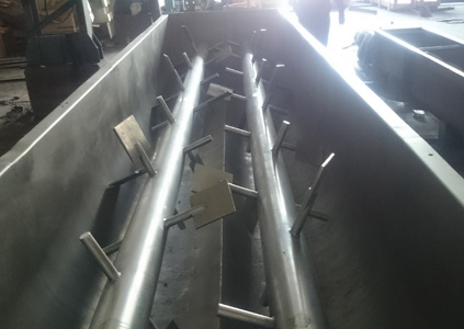 The continuous or "twin-spiral" mixer consists of a horizontal, stationary, half-cylinder with revolving helical ribbons placed on a central shaft so as to move materials from one end to the other as the shaft and ribbon rotate inside. Since material travel is from one end to the other, either end may be used for discharge.